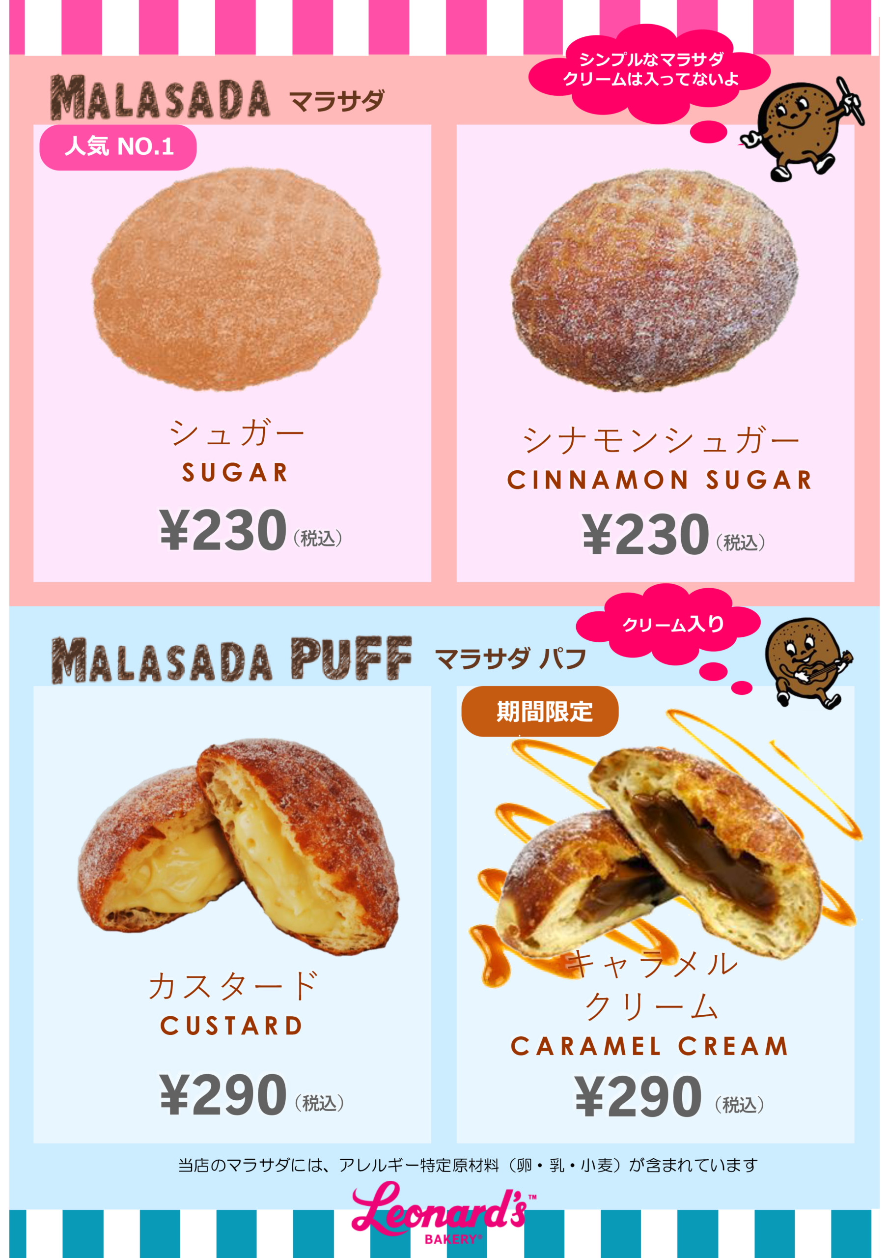 当店のマラサダは、アレルギー特定原材料(卵・乳・小麦)が含まれます。